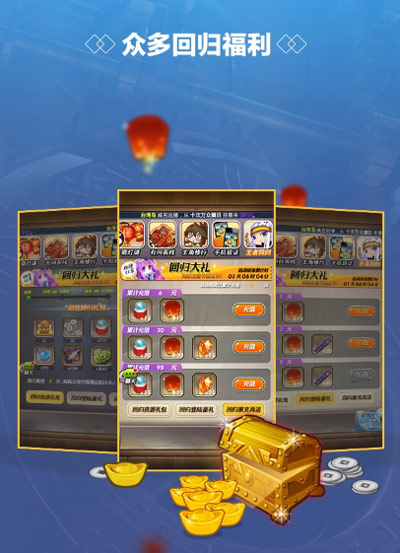 “王者回归”活动将会为所有回归玩家提供顶级的资源补给,海量经验、银币、培养丹、内力丹等等登录即赠,还有充值奖励、消费奖励等豪礼等你,助你瞬时缩短差距,再征秦时战场,重登荣耀巅峰!